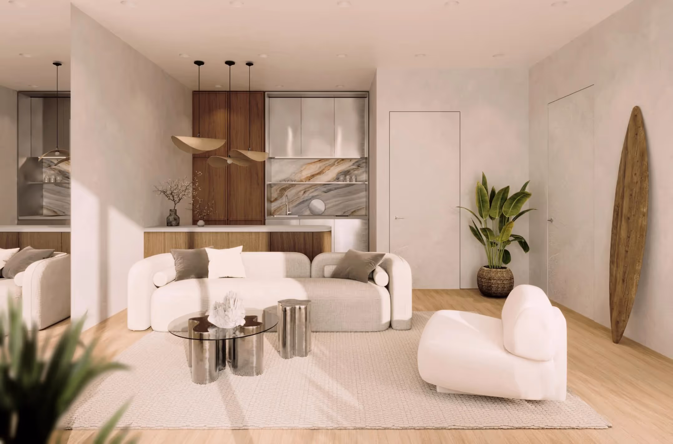 Jedes Apartment ist mit klaren, modernen Linien, neutralem Interieur und hochwertigen Oberflächen gestaltet. Raumhohe Fenster sorgen für Tageslicht, während offene Wohnräume nahtlos mit privaten Balkonen oder Terrassen verbunden sind. Zu den Gemeinschaftseinrichtungen gehört eine von tropischer Vegetation umgebene Poolterrasse, die den Bewohnern eine resortähnliche Umgebung bietet.
