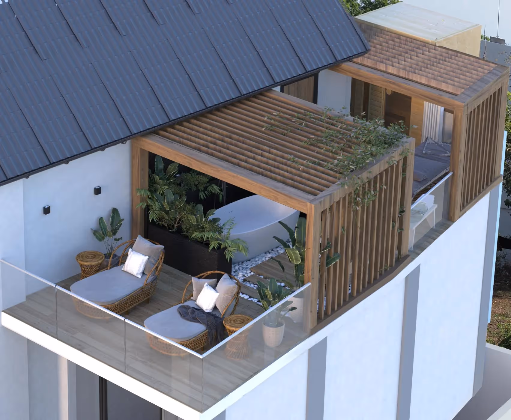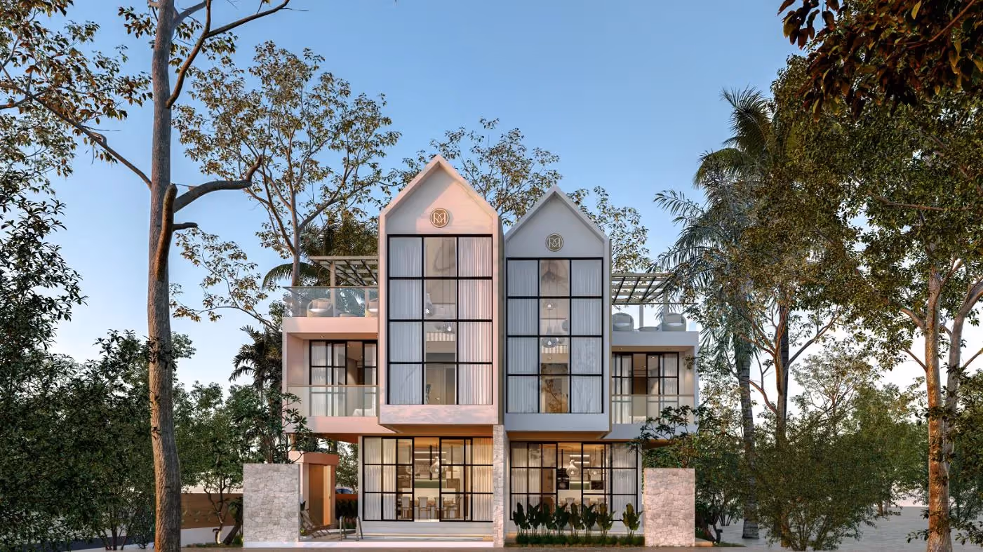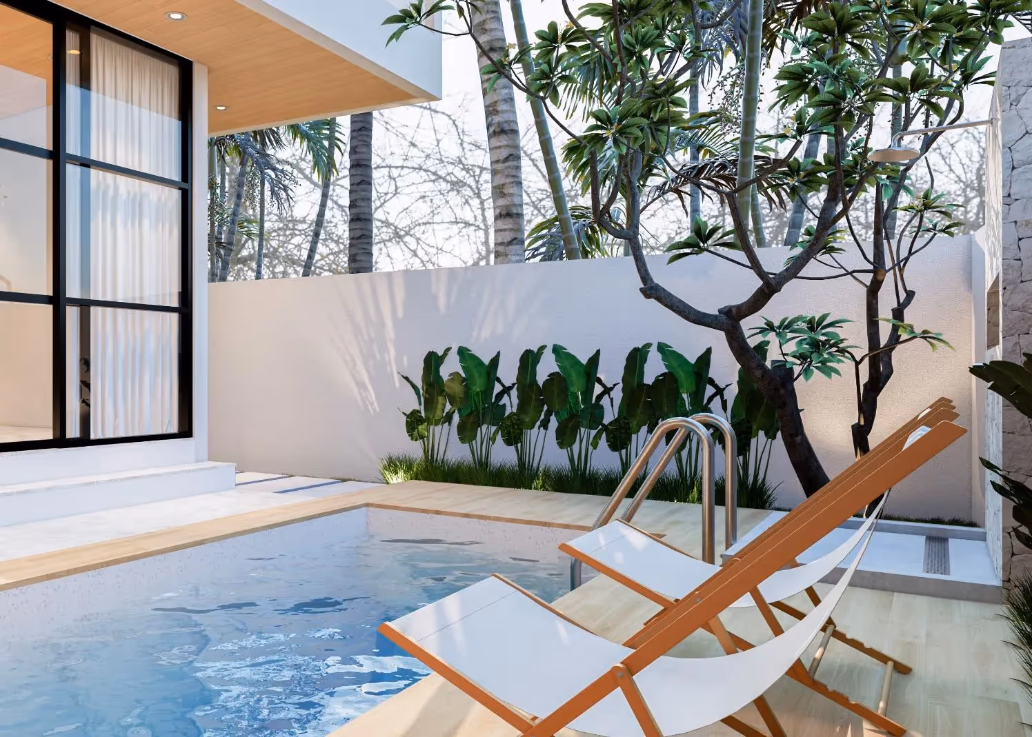 Jede Einheit verfügt über ein 138 m² großes Gebäude auf einem 100 m² großen Grundstück, das sich über zwei Ebenen mit 2 Schlafzimmern und 2,5 Bädern erstreckt. Das durchdacht angelegte Haus verfügt über einen sonnendurchfluteten Wohnbereich, eine stilvolle Küche und raumhohe Glasflächen, die zum Verweilen im Freien einladen. Im Obergeschoss verwandelt ein eigener Wellnessbereich auf dem Dach mit einer Sauna, Tagesbetten und einer Badewanne mit Meerblick das tägliche Leben in ein Resort-Erlebnis. Im Erdgeschoss vervollständigt ein privater Pool mit Naturholzterrasse das tropische Refugium. Das Design wird durch organische Texturen, Bogenmotive und einen warmen Minimalismus akzentuiert, der wunderschön fotografiert und mühelos zum Leben erklingt.