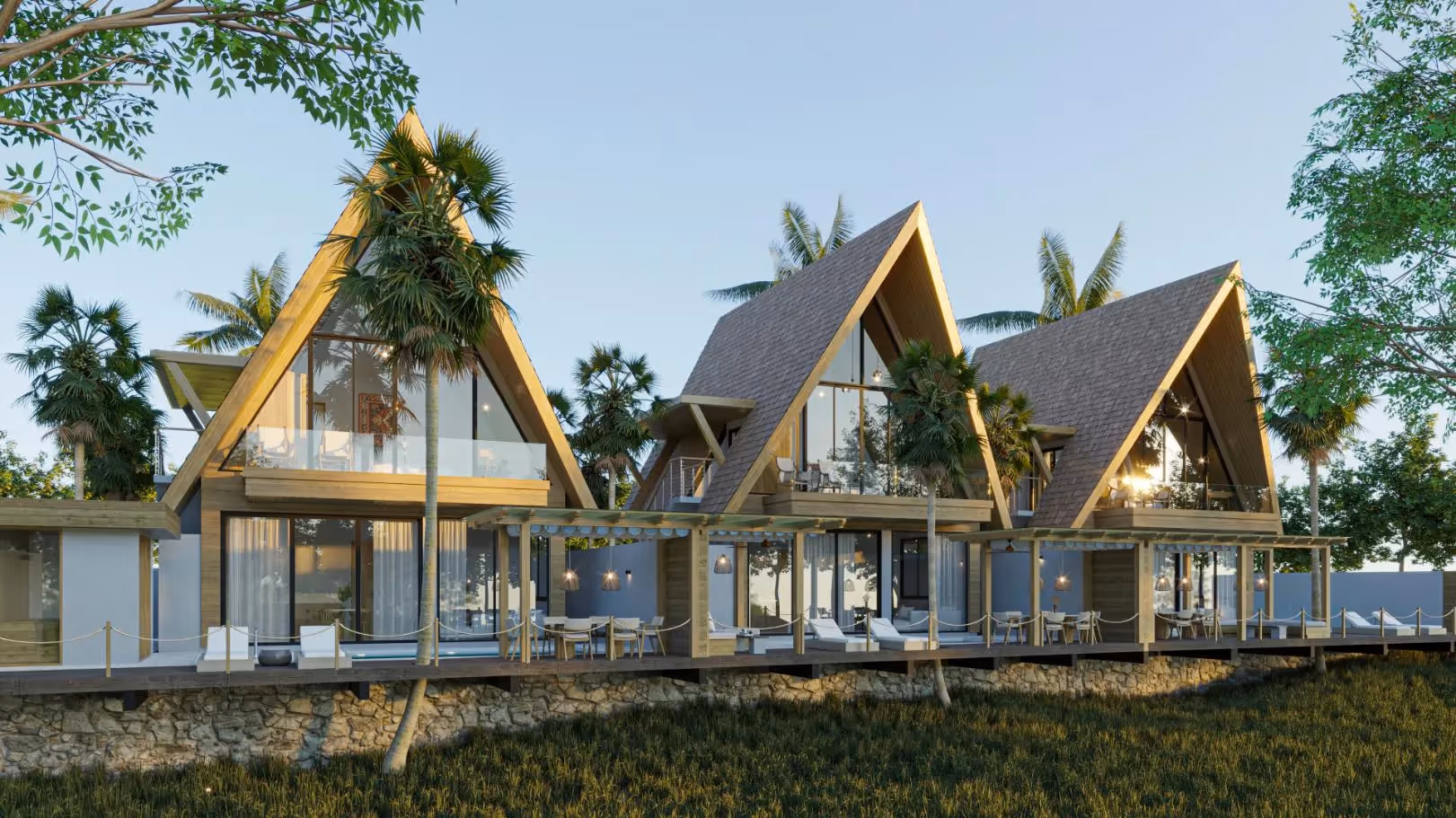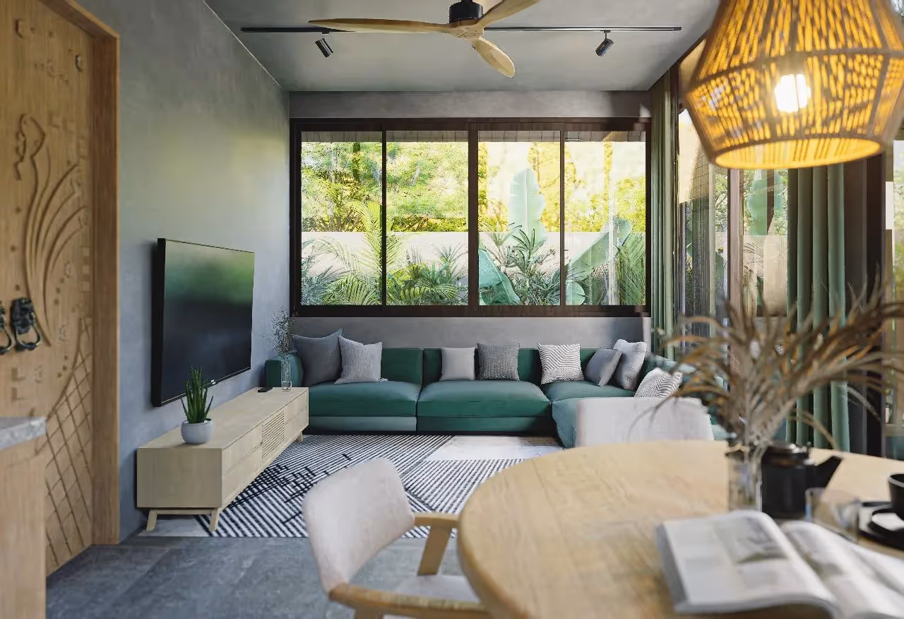 Die Holzana Villa bietet mit dieser sorgfältig gestalteten Villa mit 2 Schlafzimmern eine frische Interpretation des tropischen Wohnens. Die Villa wurde in einer kühnen A-Rahmen-Silhouette mit weitläufigen Glasfassaden entworfen und verfügt über 120 m² Innenraum und 185 m² Grundstück. Im Inneren gehen zwei Schlafzimmer, zwei Badezimmer und ein geräumiges Wohnzimmer nahtlos in eine private Terrasse und einen schattigen Essbereich im Freien über — alle mit Blick auf einen eleganten privaten Pool und ein eingebautes Eisbad für die tägliche Erholung oder Entspannung im Spa-Stil.