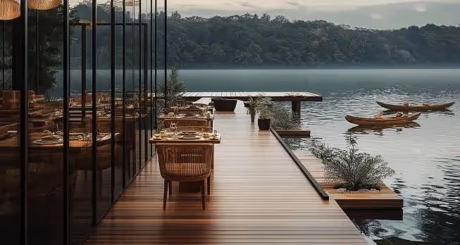 Das Hotel ist als Wellness-Refugium konzipiert und verfügt über 24 Schlafzimmer, Spa-Einrichtungen, Gemeinschaftspool und elegante Gemeinschaftsräume, die Stein, Holz und natürliche Strukturen verbinden. Große Fenster lassen natürliches Licht herein und maximieren die atemberaubende Aussicht, während die Innenräume ein warmes und einladendes Ambiente bieten.