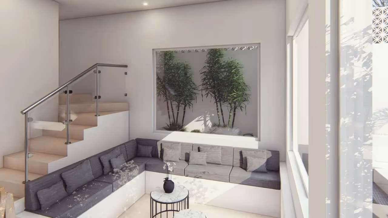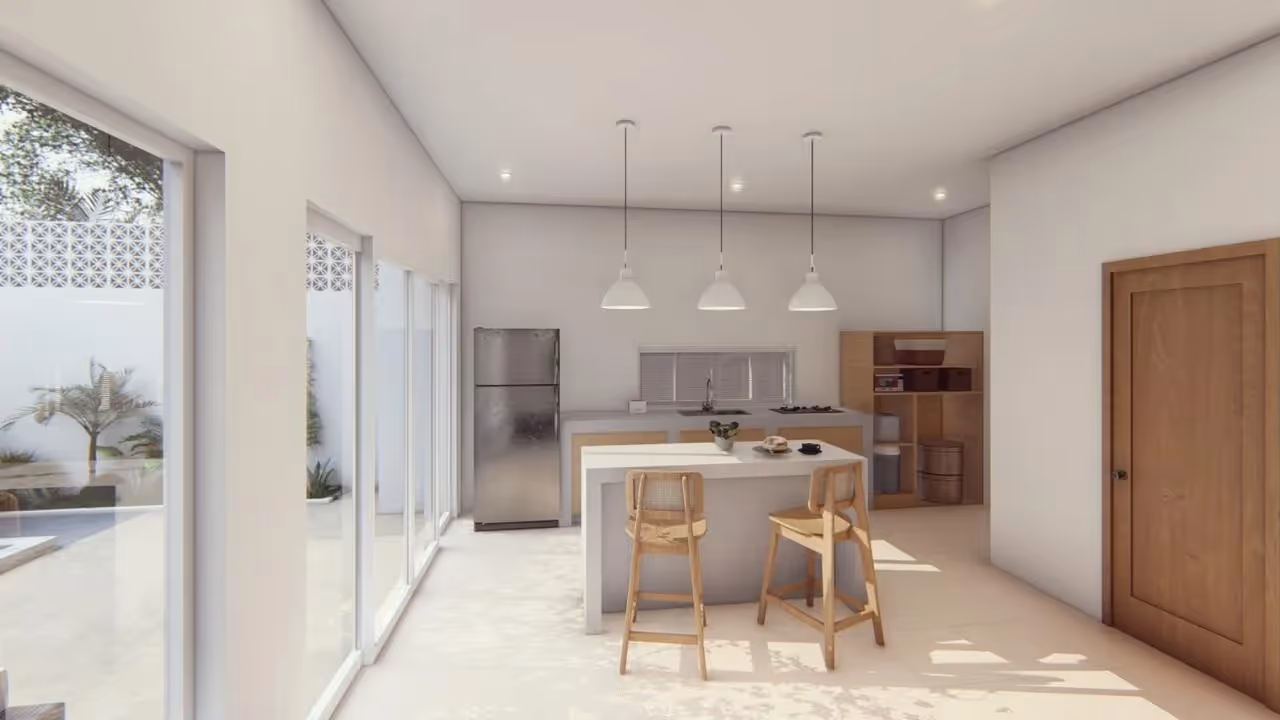 Die Villa bietet 85 m² Baufläche auf 120 m² Grundstück, darunter 2-3 Schlafzimmer, 2,5 Badezimmer und eine durchdachte offene Küche und einen Essbereich. Glasschiebetüren durchfluten die Innenräume mit Tageslicht und verbinden sich nahtlos mit dem Innenhof im Freien, wo ein privater Pool und eine üppige Bepflanzung für einen ruhigen Rückzugsort sorgen. Einzigartige Elemente wie eine eingelassene Lounge im Innenbereich und ein Balkon im Obergeschoss sorgen für architektonisches Flair und alltäglichen Komfort.
