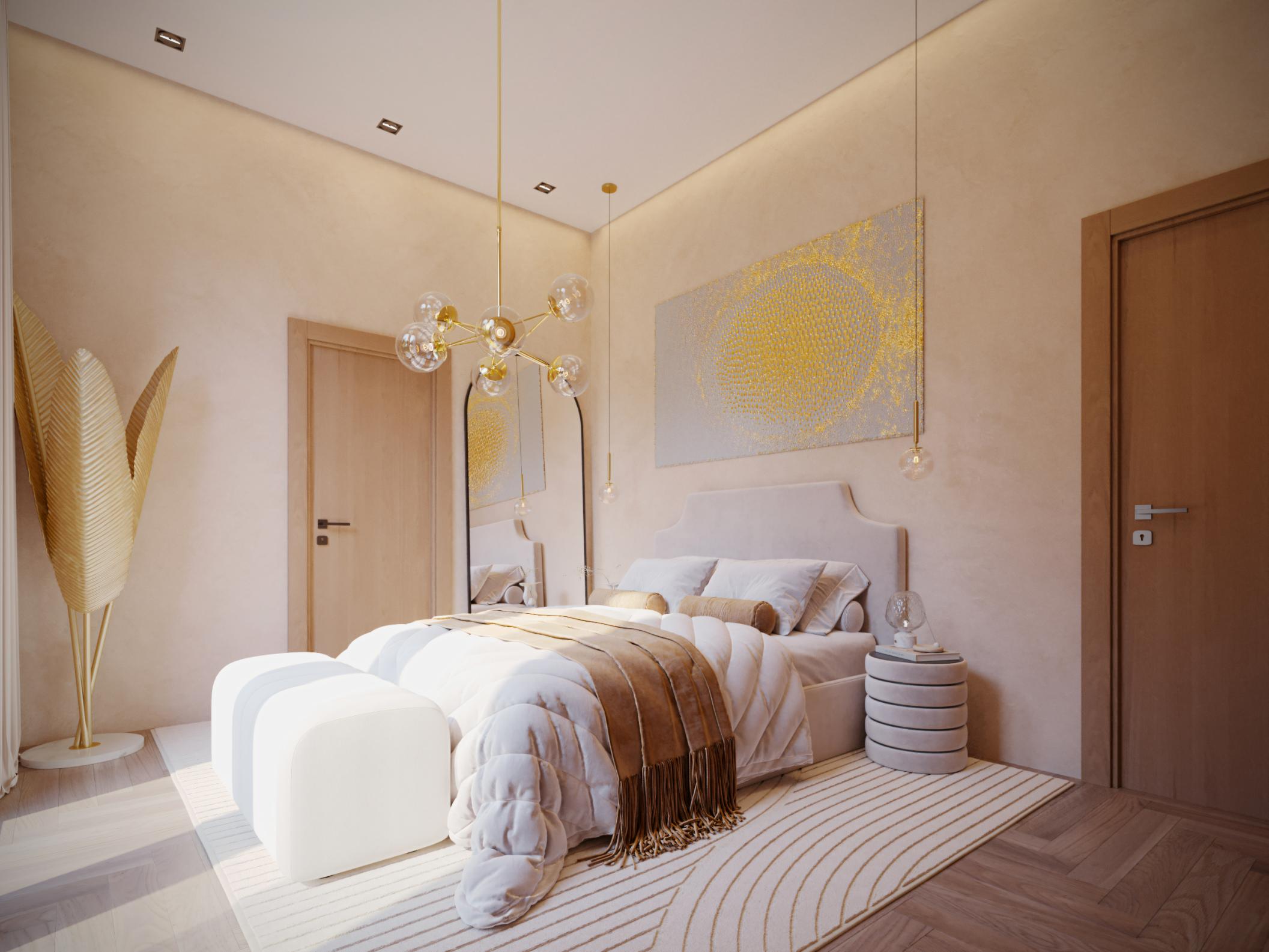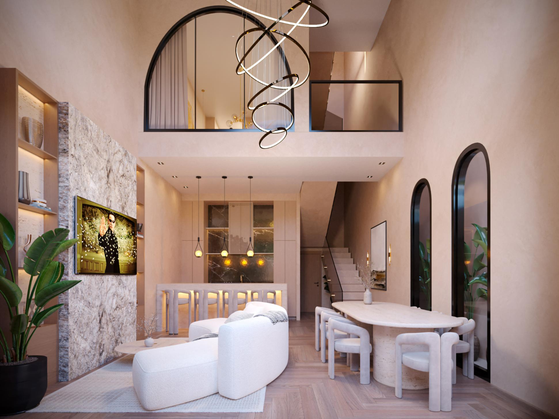 The villa provides 134 m² of building space on 97 m² of land, carefully designed to create a comfortable sense of openness while maintaining privacy. High ceilings and large arched windows allow natural light to flow throughout the interior, creating a bright and welcoming atmosphere that complements the warm, natural finishes used throughout the home.