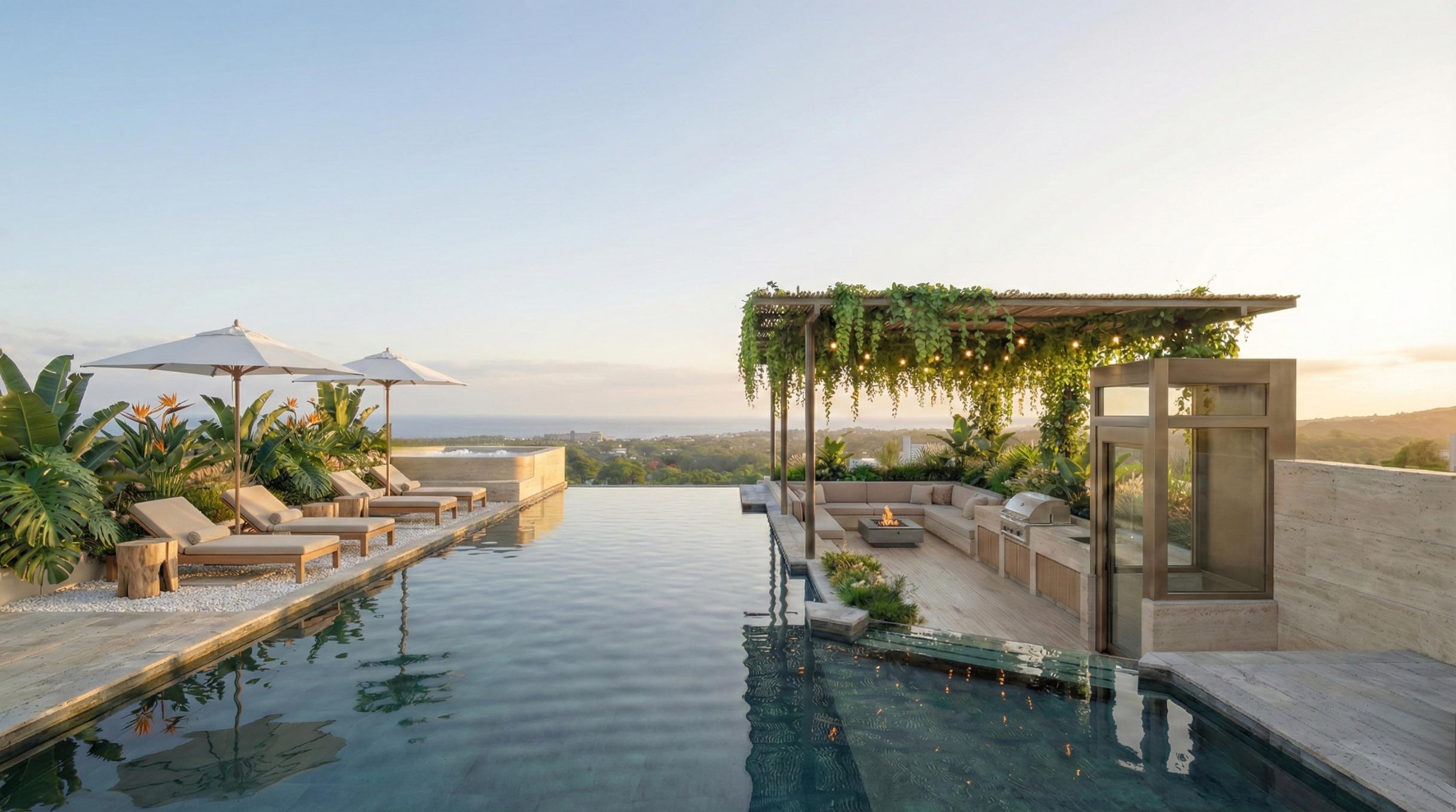 Skyline Serenity Retreat is a distinctive 6-bedroom villa in Bingin, designed to capture uninterrupted 180-degree ocean views and Bali’s signature sunsets. Positioned within a boutique hotel-style development, this property blends private luxury with curated lifestyle amenities, making it a compelling choice for those buying property in Bali or seeking a high-performing bali investment uluwatu.