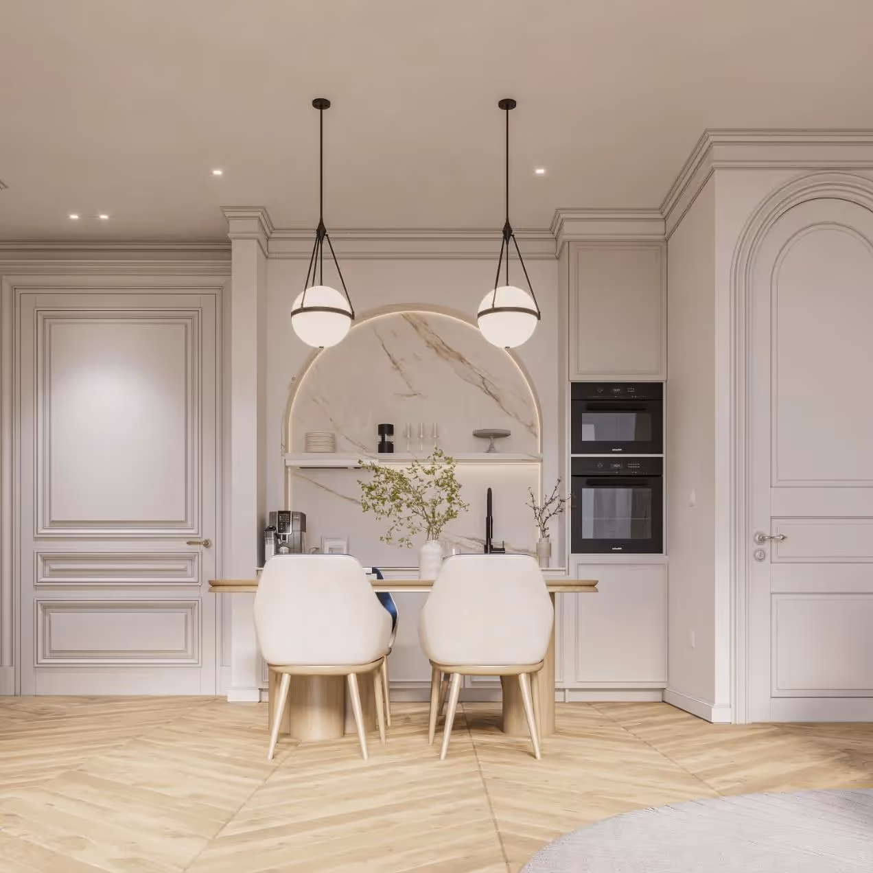 Die Master Suite verkörpert ruhigen Luxus mit eleganten Wandverkleidungen, neutralen Textilien und einem eigenen Badezimmer im Spa-Stil, das aus Naturstein und gebürstetem Messing gefertigt ist. Jedes Detail wurde so ausgewählt, dass es eine ruhige Raffinesse hervorruft — von der handgefertigten Beleuchtung über die Marmoroberflächen bis hin zu den maßgeschneiderten Möbeln.