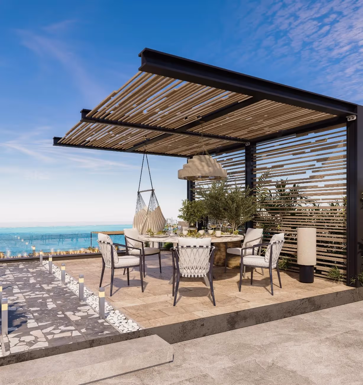 Im Obergeschoss bieten beide Schlafzimmer einen Panoramablick auf das Meer, private Balkone und ein eigenes Badezimmer mit Marmor- und Goldakzenten. Eine Dachterrasse mit eingebauten Sitzgelegenheiten und einer Pergola zum Essen bietet den perfekten Ort für Unterhaltung bei Sonnenuntergang, während ein Freiluftkino ein einzigartiges Lifestyle-Feature bietet, das auf Bali selten zu finden ist.