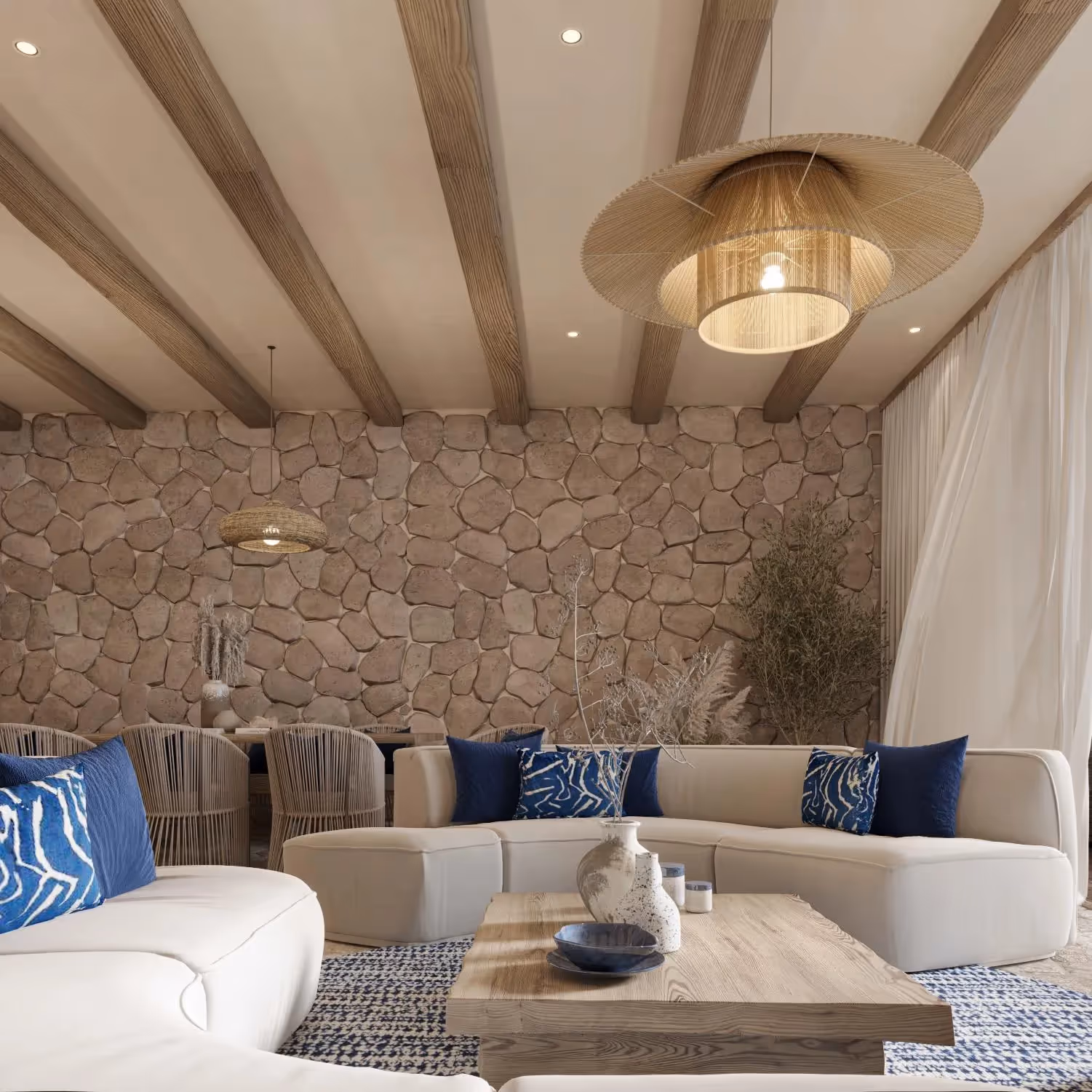 Die Architektur der Villa ist von Ibizas entspannter Küstengestaltung inspiriert, die durch eine tropische Linse umgesetzt wurde. Jedes Detail — von natürlichen Kalksteinböden bis hin zu weich getönten Hölzern und organischen Kurven — spiegelt mühelose Raffinesse wider. Das Layout erstreckt sich über 348 m² Innenraum auf 190 m² Grundstück und umfasst drei Schlafzimmer, 3,5 Badezimmer und einen nahtlosen offenen Wohnbereich, der sich zum Infinity-Pool und zum Meereshorizont hin öffnet.