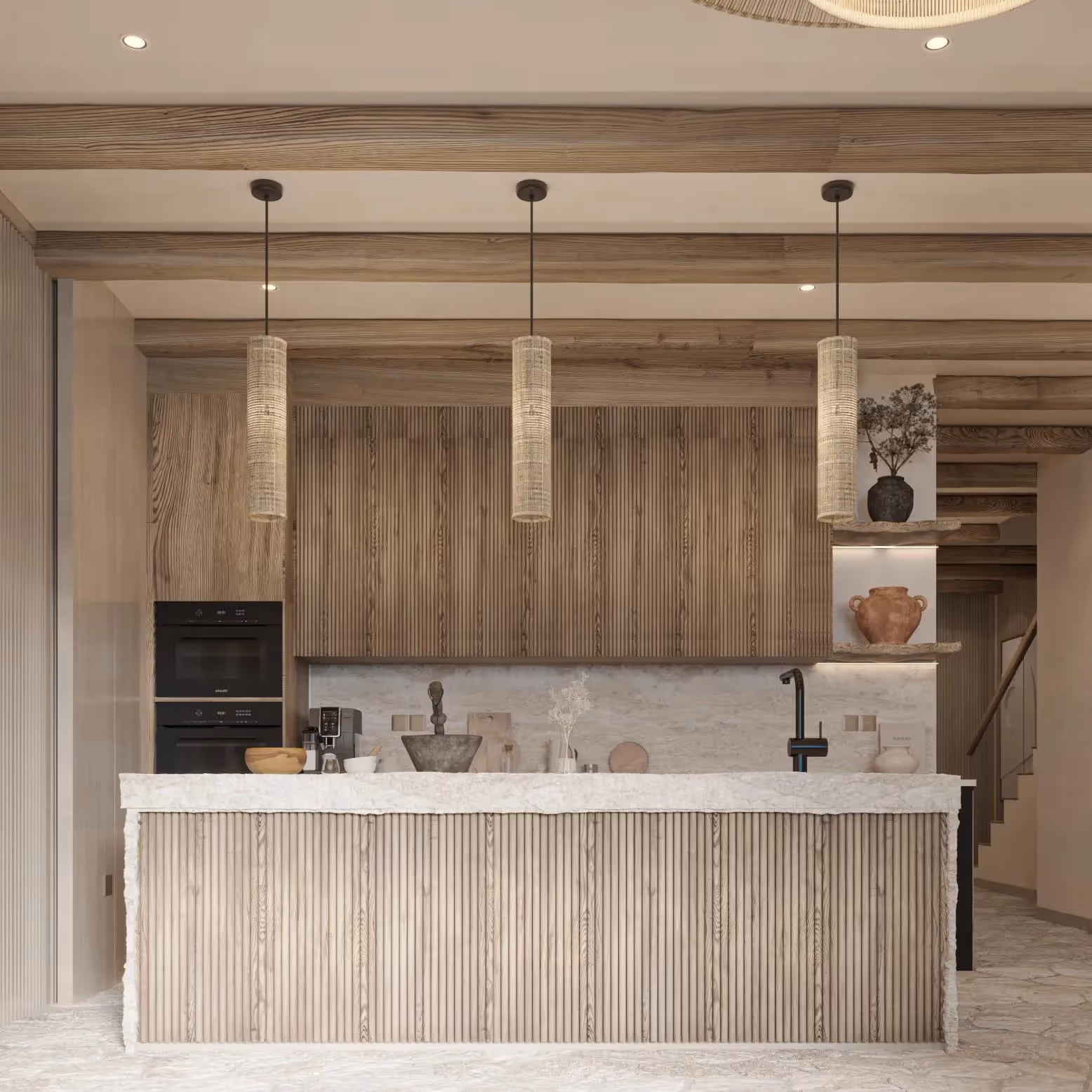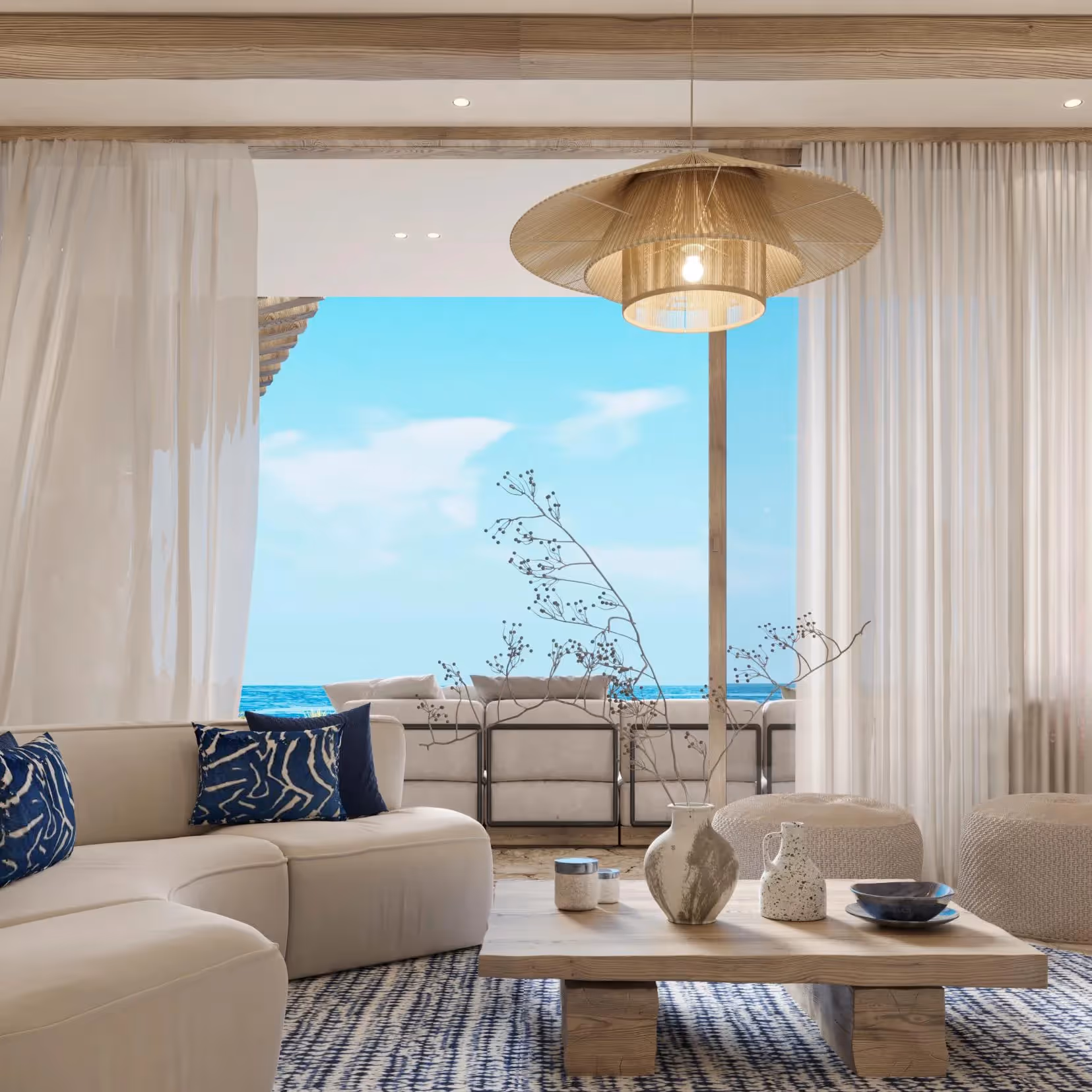 Das Wohnzimmer verfügt über geschwungene, maßgefertigte Sofas, handgefertigte Beleuchtung und neutrale Texturen, die durch tiefe Ozeanblautöne akzentuiert werden und an die ruhige Eleganz des mediterranen Designs erinnern. Die Küche und der Essbereich verbinden Funktion und Kunst mit Steintheken, Holzdetails und modernen Einbaugeräten. Jedes Schlafzimmer bietet Privatsphäre, ein eigenes Bad und einen Blick auf den Ozean, der von raumhohen Glasflächen eingerahmt wird.