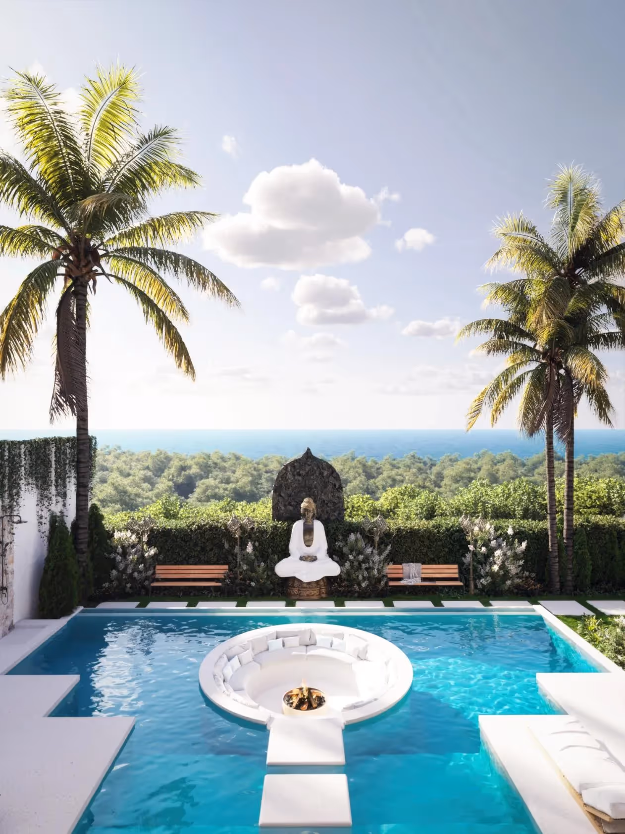 Diese freistehende Eigentumsvilla in Pandawa wurde für ein raffiniertes tropisches Wohnen entworfen und bietet eine nahtlose Mischung aus Eleganz und Komfort. Das 354 m² große Haus erstreckt sich über 800 m² Grundstück und verfügt über vier Schlafzimmer, jedes mit eigenem Bad, sowie ein zusätzliches Gästebad. Die Architektur besteht aus Naturstein, hohen Strohdecken und weitläufigen Glastüren, die den üppigen Garten- und Poolblick einrahmen.