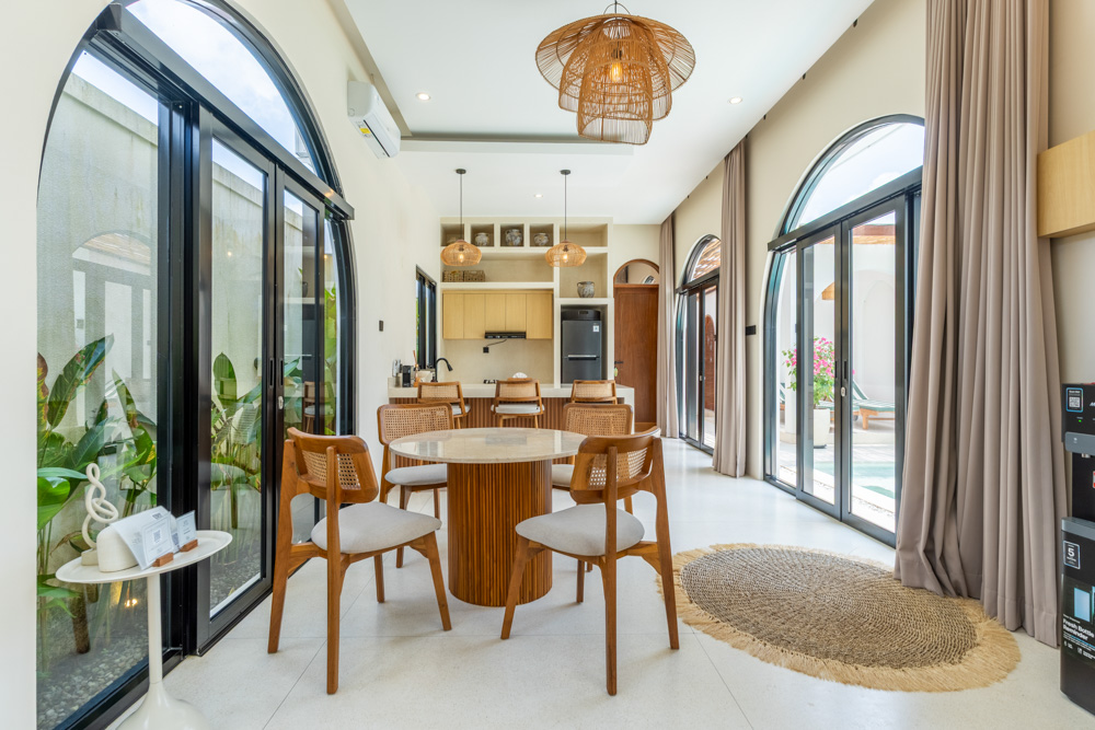 Située sur 225 m² de terrain avec un bâtiment généreux de 160 m², la propriété est proposée en tant que bail avec 29 ans restants et des options d'extension sont disponibles. L'aménagement comprend deux chambres bien proportionnées et deux salles de bains, conçues avec des courbes douces, des éléments intégrés et des finitions naturelles chaudes. De grandes fenêtres cintrées permettent à la lumière naturelle de circuler dans toute la villa tout en préservant l'intimité.