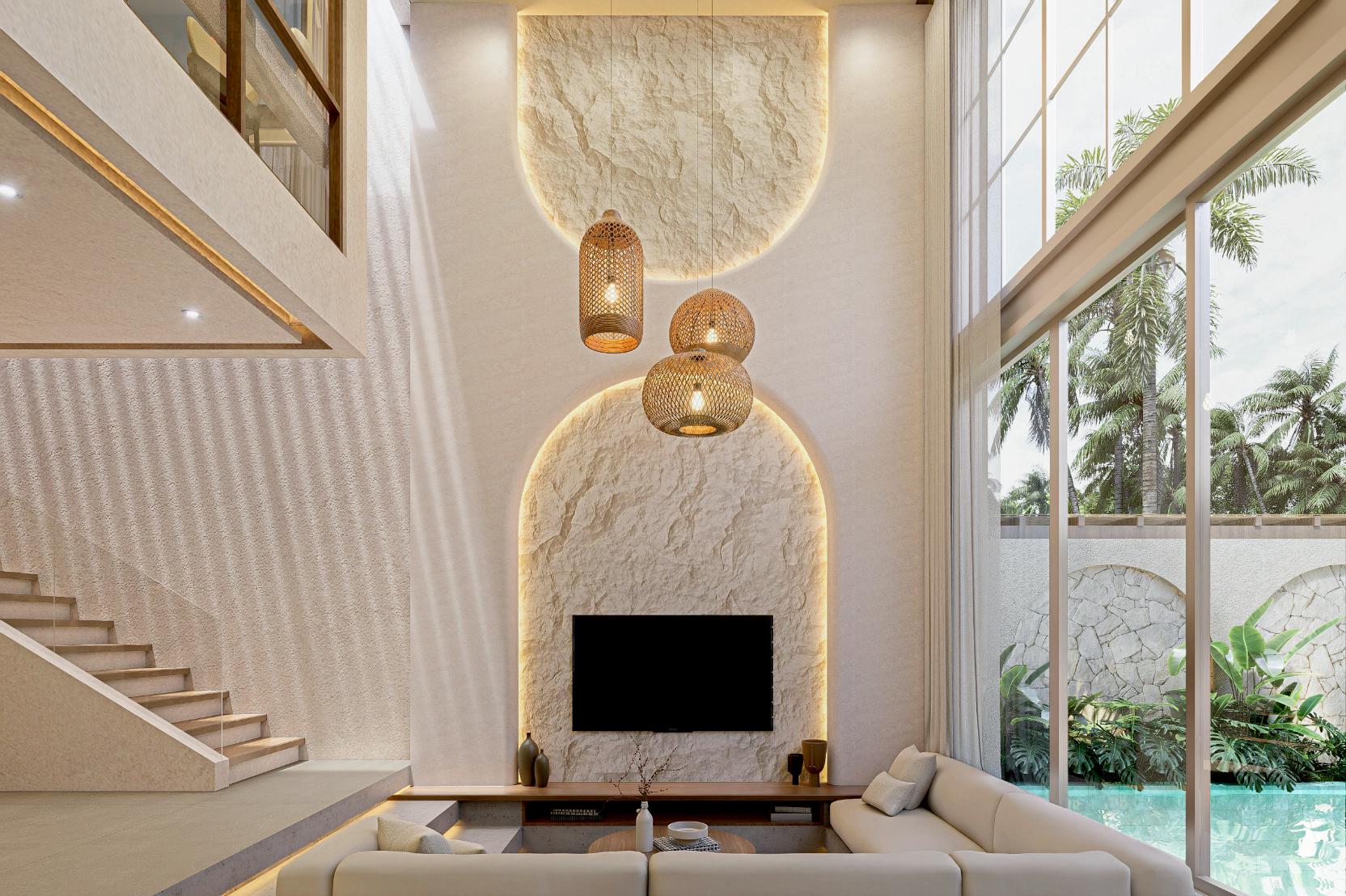 The architectural concept draws inspiration from Mediterranean design, incorporating arched forms, textured walls, and warm neutral tones that complement Bali’s natural surroundings. These elements create a soft and elegant aesthetic while maintaining functionality for everyday tropical living.