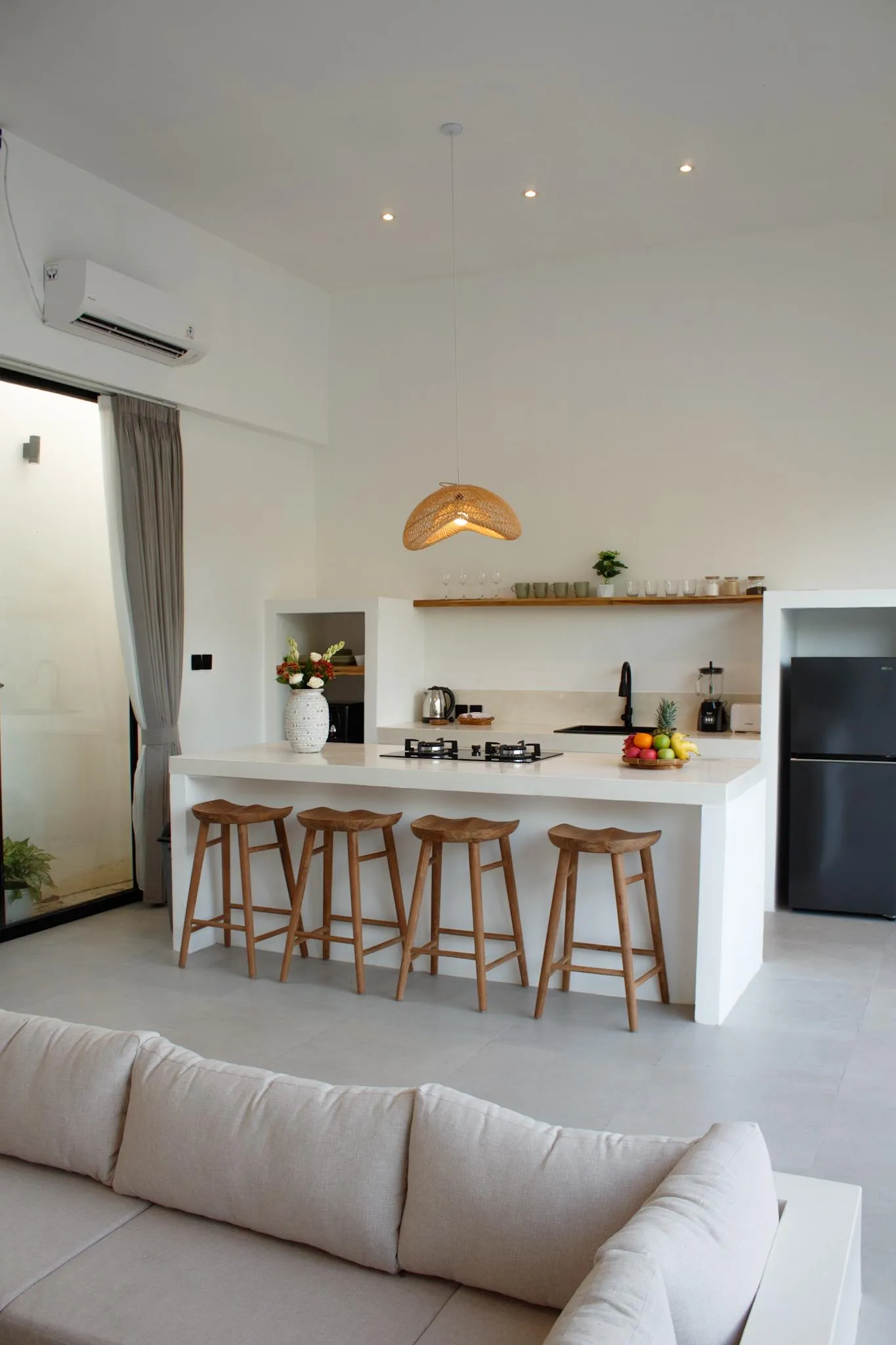 The villa is built on 200 m² of land with a total building size of 190 m². Buyers can choose between 2- or 3-bedroom configurations with a total of 3–4 bathrooms. Each bedroom is designed with an ensuite bathroom, complemented by an additional guest bathroom located within the main living area, offering practical convenience for daily living and entertaining. The enclosed living, dining, and kitchen area is designed for year-round comfort, with seamless access to the outdoor space where a private swimming pool is framed by greenery. The kitchen features a functional island layout, integrated storage, and warm wood finishes. The villa is delivered fully furnished, allowing for immediate use or rental setup upon completion.