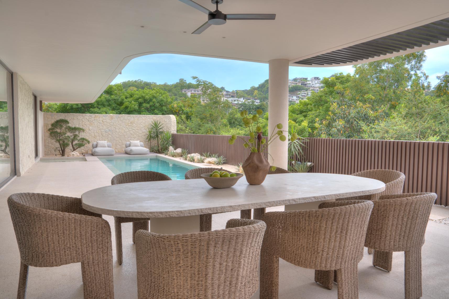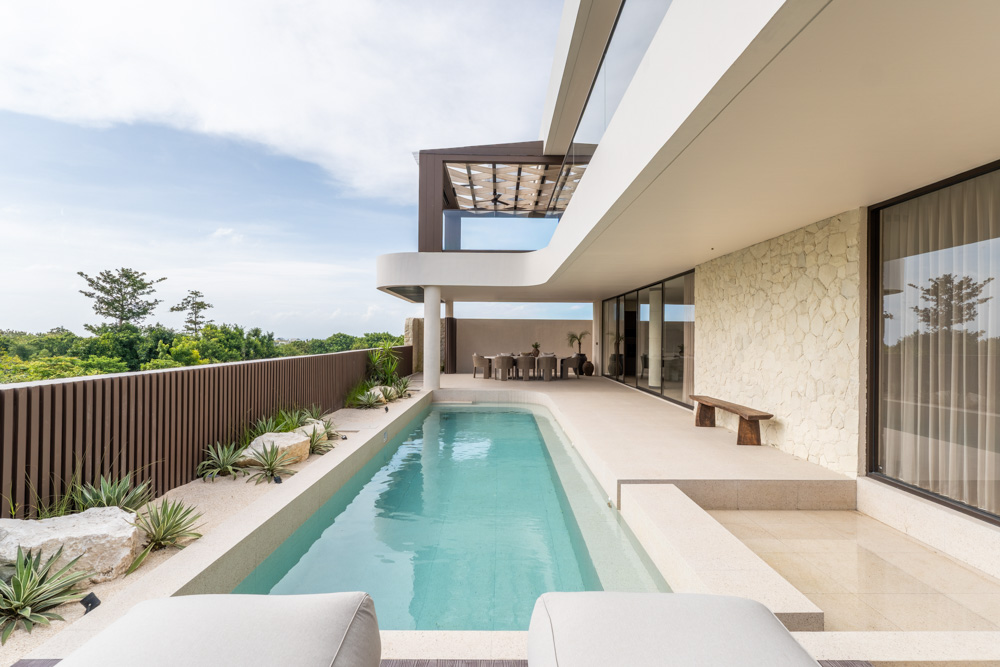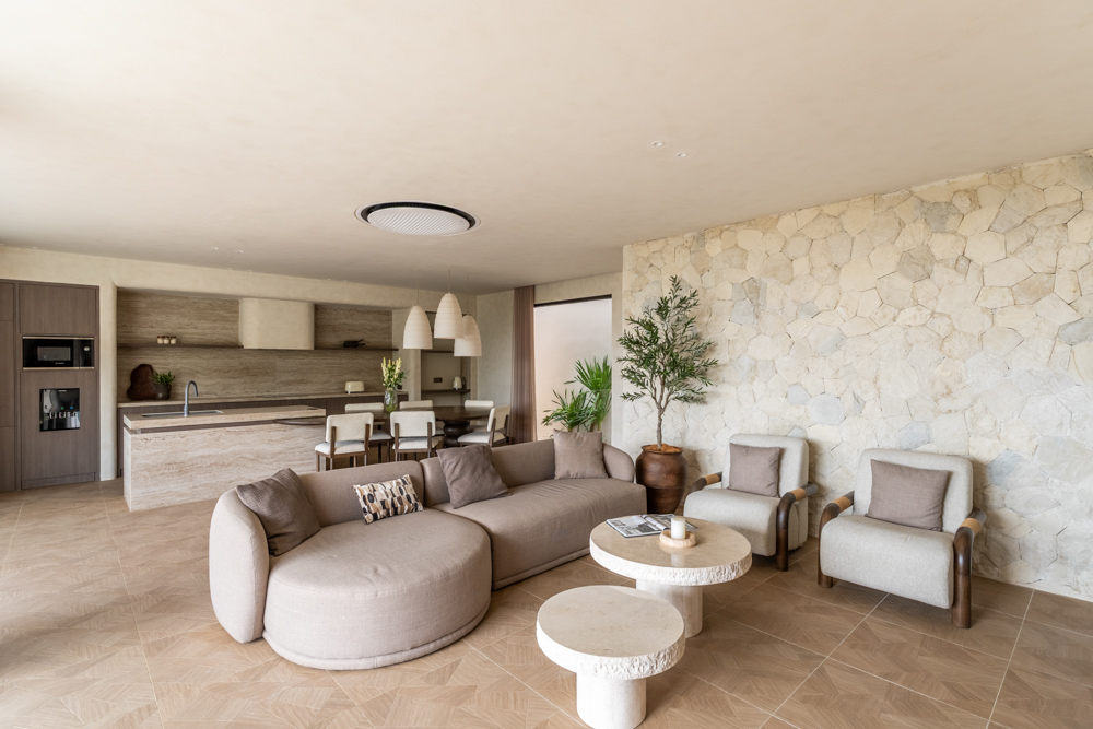 The villa includes one bedroom and one bathroom, designed with warm lighting and elegant materials. The bedroom opens onto a spacious terrace where residents can enjoy fresh ocean breezes and views of the surrounding greenery.