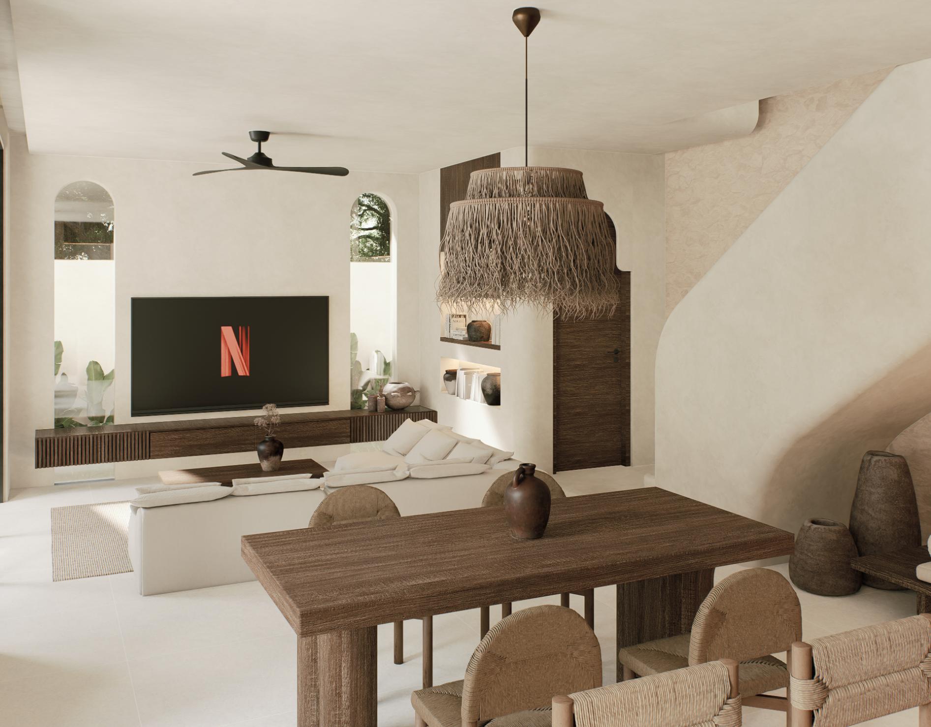 Upstairs, the villa includes two bedrooms with ensuite bathrooms, designed with soft natural finishes and a focus on comfort and privacy. The property also includes an additional guest toilet, making it suitable for both personal use and rental accommodation. Fully furnished, the interiors reflect a contemporary Mediterranean aesthetic with biophilic design elements that enhance airflow and natural lighting.