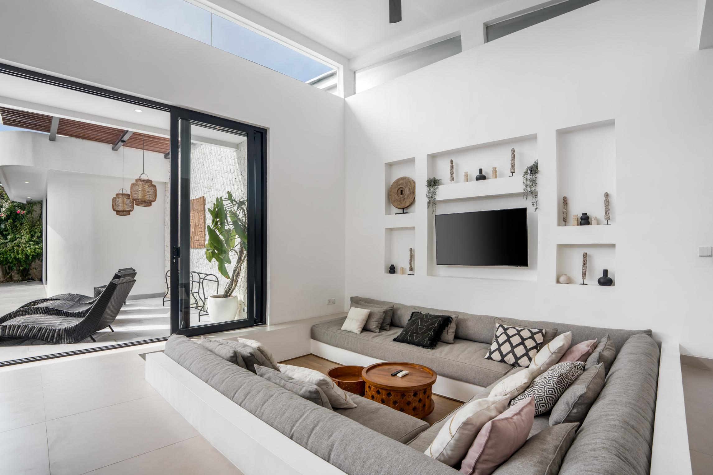 The open-concept living area includes a sunken lounge, dining space, and a modern kitchen with stone detailing and wooden accents. Floor-to-ceiling glass doors lead to a private pool surrounded by tropical landscaping, creating a relaxed yet elegant atmosphere. Each bedroom is ensuite with custom finishes and spa-style bathrooms, featuring terrazzo tubs and rainfall showers.