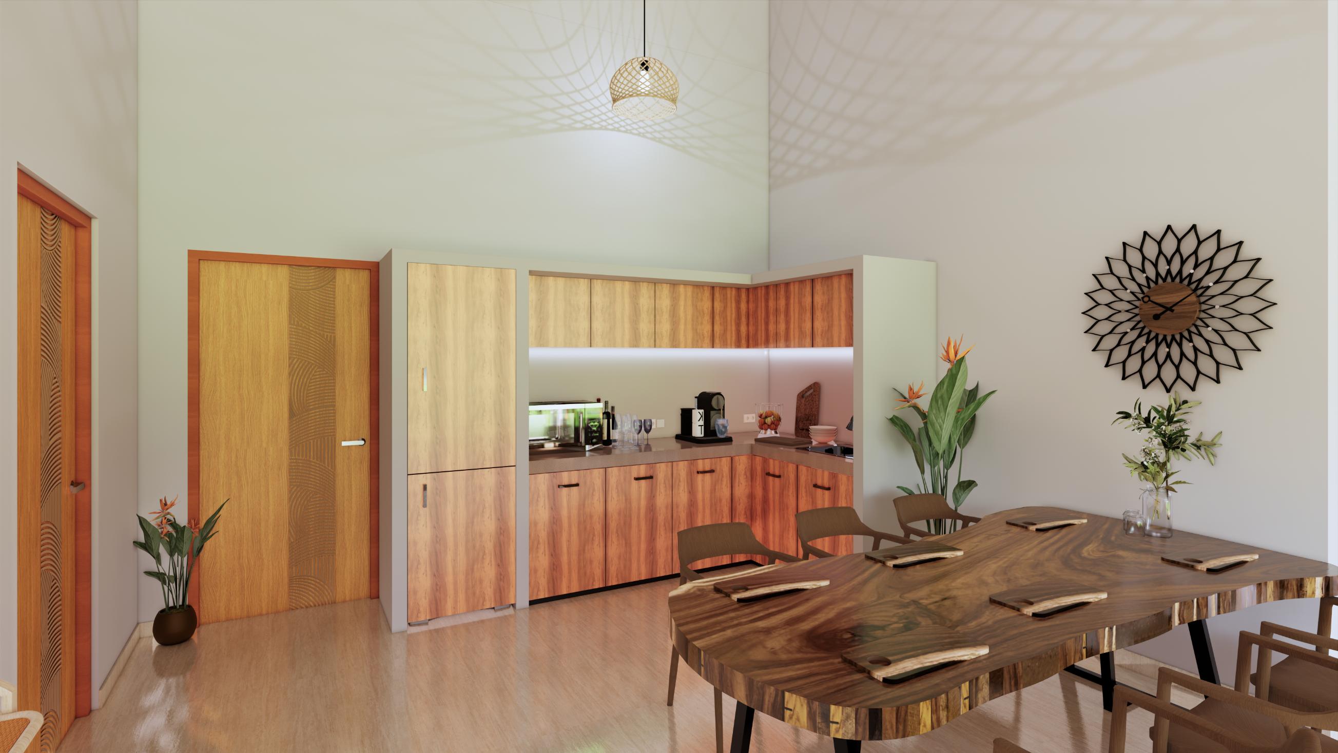 The villa spans 120–127 m² of building space on 179–190 m² of land. It comes semi-furnished, with 2 bedrooms, 2.5 bathrooms, and open-plan living areas that flow into a green courtyard. Floor-to-ceiling windows frame the private garden, while the curated layout includes an outdoor sunken lounge, poolside deck, and warm lighting throughout. The kitchen and dining areas are designed for relaxed hosting and day-to-day functionality.