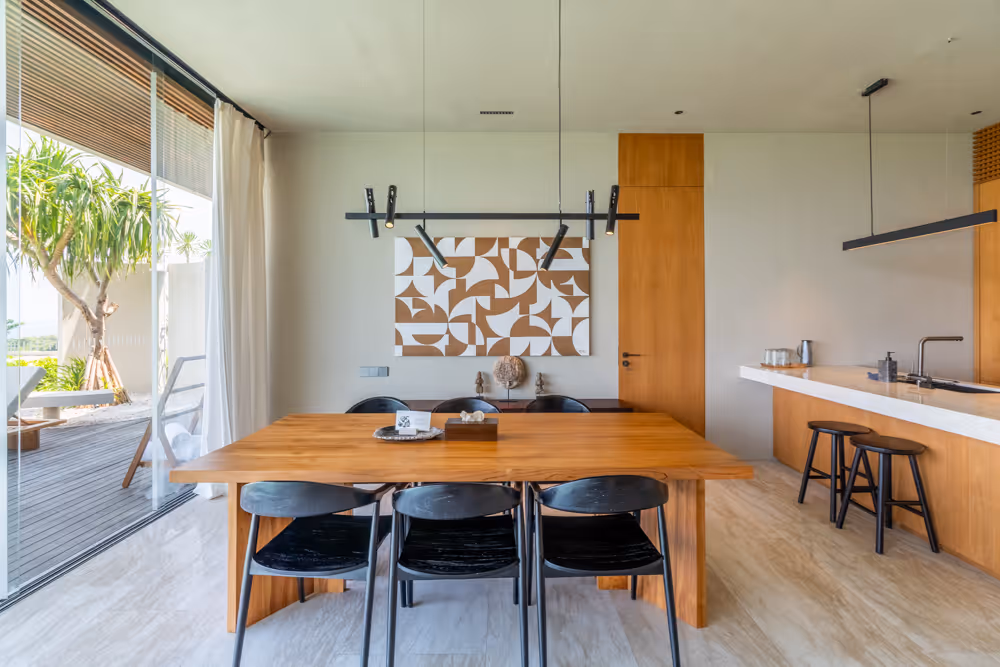Set in the lush hills of Melasti, this 2-bedroom leasehold villa blends architectural elegance with ocean-facing tranquility. With a generous 195 m² of indoor living space and a 300 m² land plot, the villa’s sleek design features clean lines, natural wood finishes, and full-height glass doors that open onto a private pool deck. The villa is fully furnished and thoughtfully laid out with 2 spacious bedrooms, 2.5 bathrooms, and a flowing open-concept living and dining area.