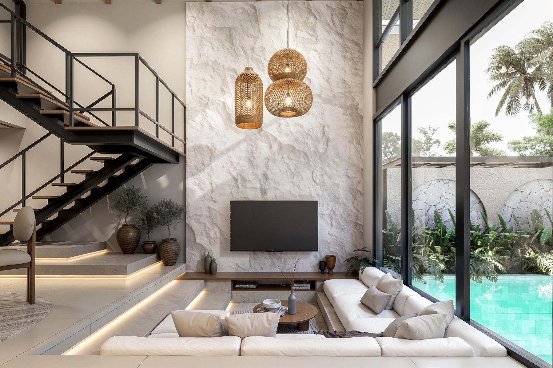 The architectural concept emphasizes modern industrial design, incorporating clean geometric forms, contemporary textures, and large glass openings that strengthen the relationship between indoor and outdoor spaces. These elements are balanced with tropical landscaping to create a visually striking yet comfortable residential setting.