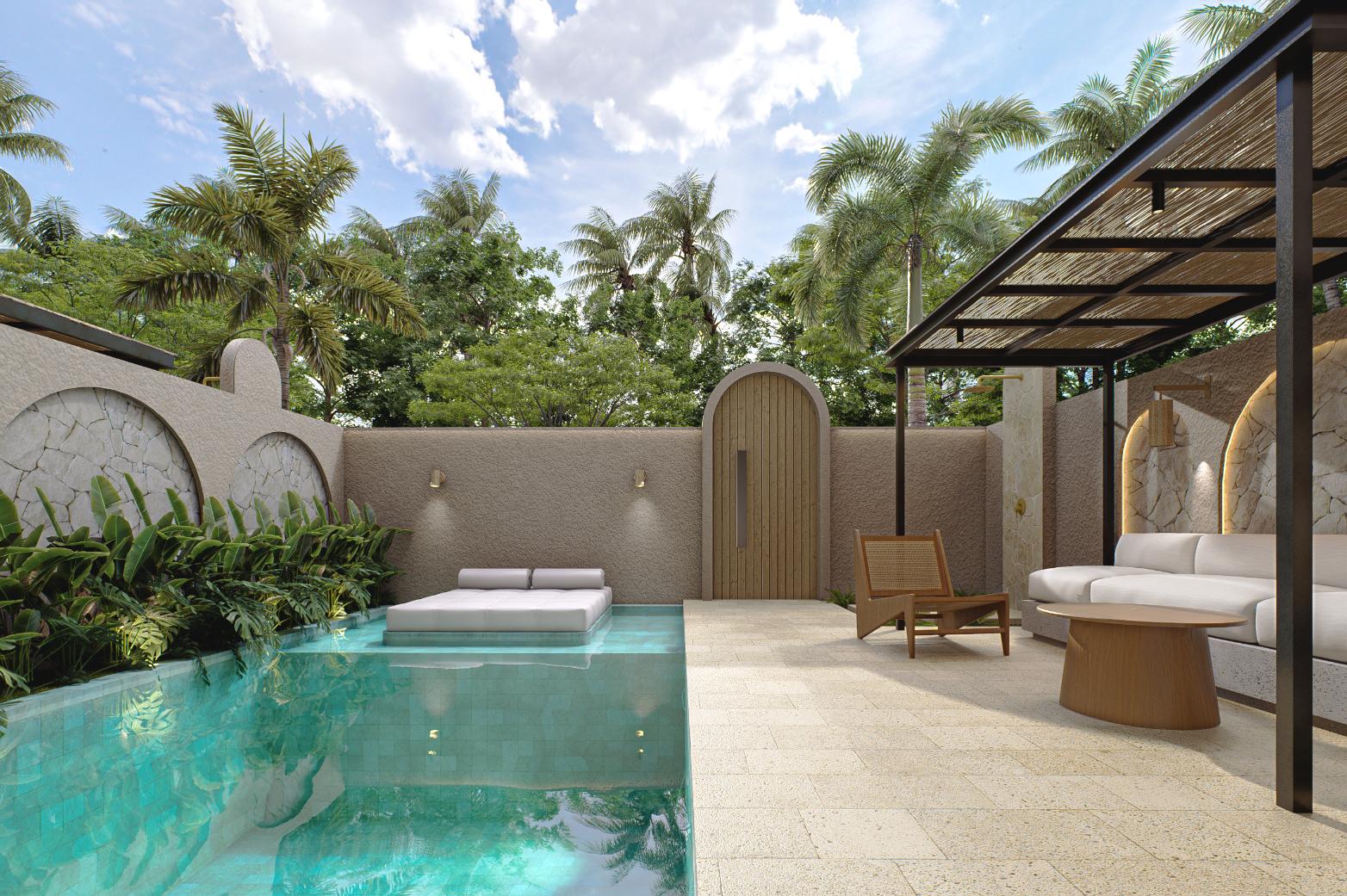 The property features an open living concept that connects directly to the outdoor area, encouraging natural airflow and relaxed tropical living. At the center of the courtyard sits a private swimming pool, surrounded by landscaped garden elements that enhance privacy and create a calm residential atmosphere.