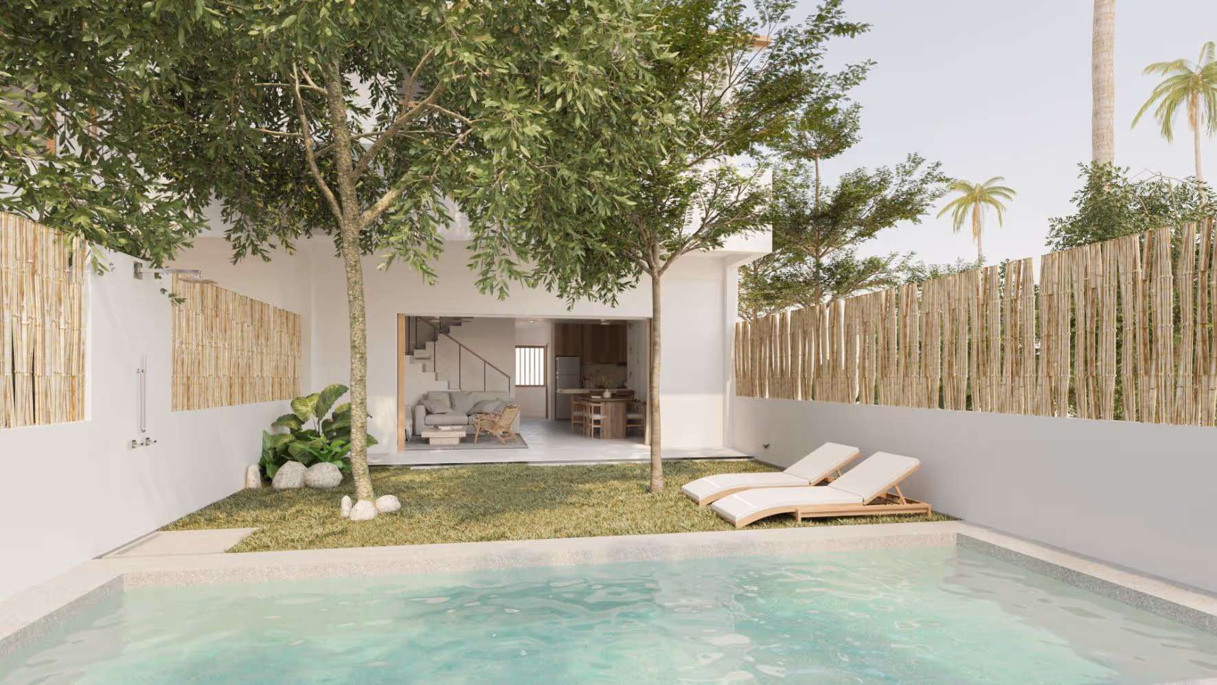 The villa spans 163 m² of interior space on 148 m² of land, complemented by a 40 m² rooftop terrace. Offered fully furnished under a 30-year leasehold with an additional 20-year extension option (until July 2073), the property is ready to move soon. The layout includes three well-proportioned bedrooms and three bathrooms, an enclosed living and dining area, and a modern kitchen with custom wood cabinetry and built-in shelving. Large sliding doors open to a private garden and swimming pool, creating a seamless indoor-outdoor flow. The rooftop level provides additional lounge and dining space, ideal for sunset gatherings or private relaxation.