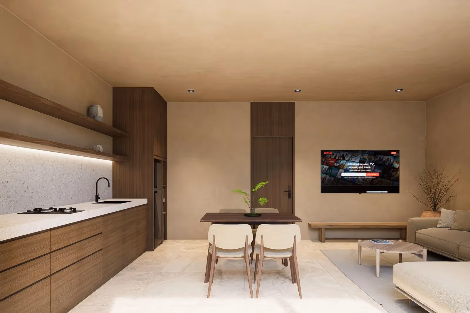 The villa spans 103 m² of interior space on a compact 1.1 are plot, complemented by a 6 m² private pool. Fully furnished with custom-built pieces and a soft neutral palette, the layout features an open-plan living area, a modern kitchen with clean wood finishes, and two comfortable bedrooms with built-in wardrobes and workspaces. Large sliding glass doors create a seamless indoor-outdoor flow, opening to the courtyard and pool area. An additional highlight is the rooftop lounge — ideal for sunset gatherings or quiet mornings with treetop views.