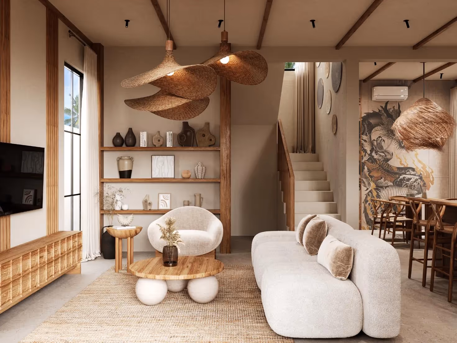 Эта вилла с 2 спальнями, расположенная в Убуде, культурном и художественном центре Бали, сочетает в себе тропический образ жизни и современный комфорт. Вилла площадью 96,8 м² на участке площадью 140—141 м² состоит из светлой гостиной и столовой открытой планировки, полностью оборудованной кухни с отделкой из натурального дерева и двух просторных спален с ванными комнатами. Интерьер оформлен в теплом минималистском стиле, а естественные текстуры и индивидуальные детали придают интерьеру неповторимый характер.