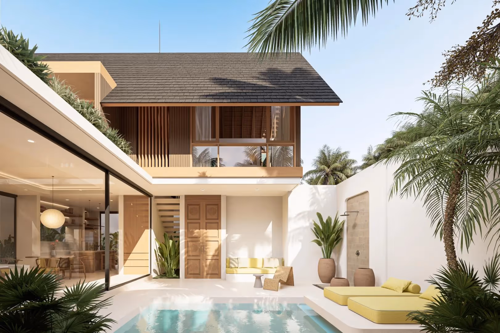 Площадь застройки виллы составляет 120—127 м² на участке площадью 179—190 м². Вилла частично меблирована и состоит из 2 спален, 2,5 ванных комнат и гостиной открытой планировки, выходящей в зеленый двор. Окна от пола до потолка обрамляют частный сад, а продуманная планировка включает в себя открытую гостиную, террасу у бассейна и теплое освещение во всех помещениях. Кухня и обеденная зона предназначены для непринужденного отдыха и повседневной функциональности.