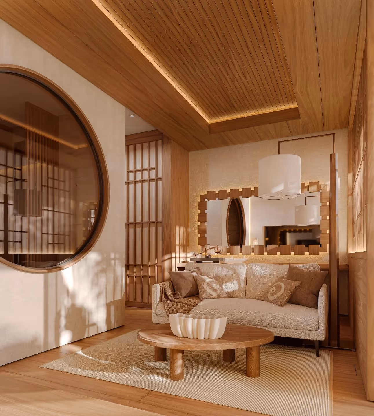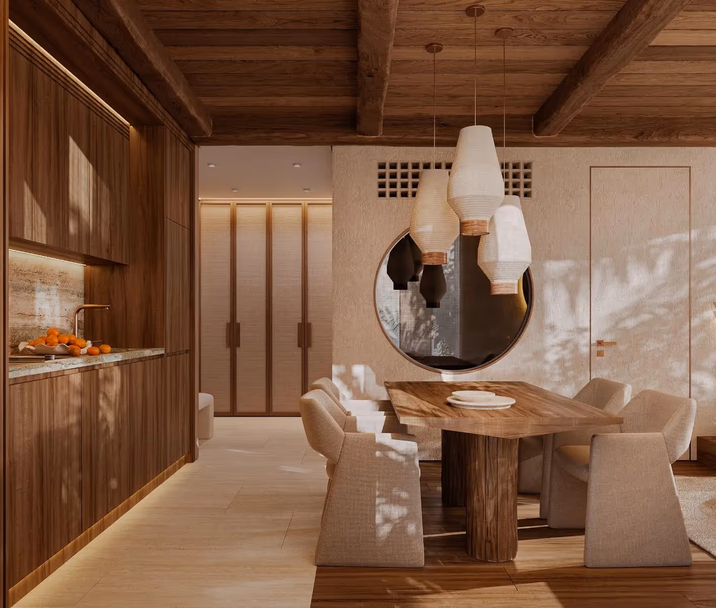 Каждый номер поставляется «под ключ» с теплыми натуральными текстурами, тонким освещением, встроенными стеллажами и индивидуальной мебелью. В ванных комнатах изогнутые углы, каменные туалетные столики и зеркала с подсветкой, а компактные мини-кухни идеально сочетаются с жилыми зонами открытой планировки. Большие окна пропускают естественный свет и открывают вид на джунгли.
