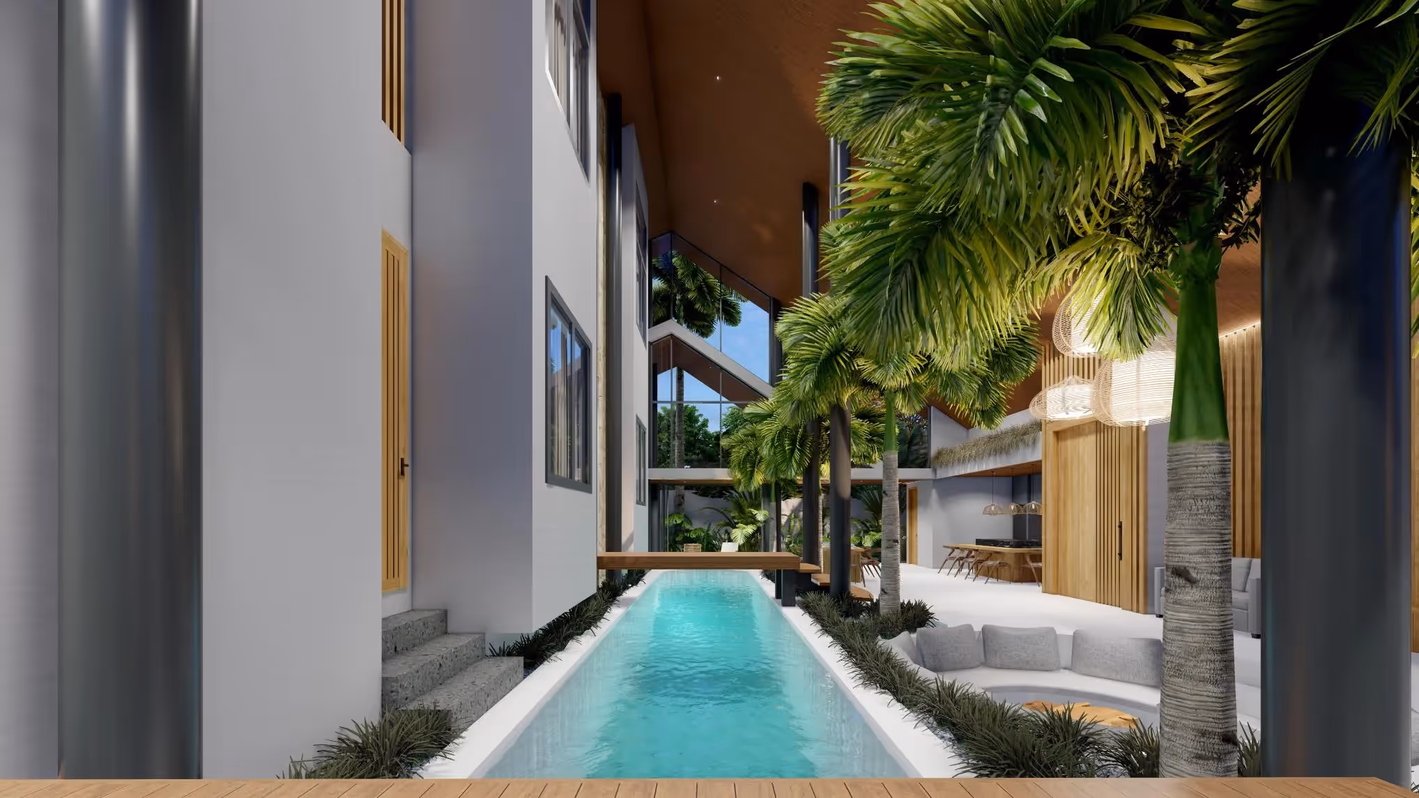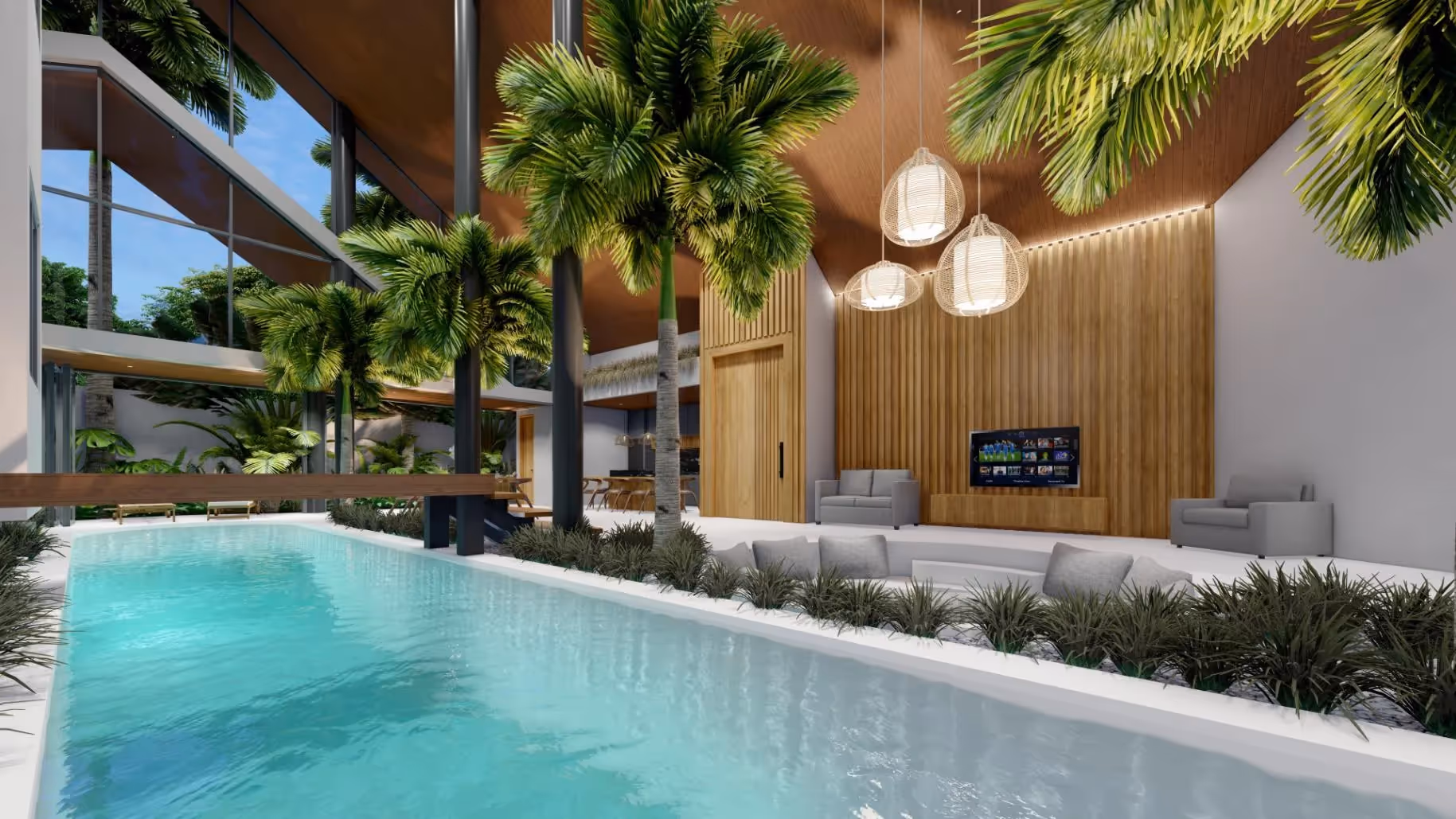 Внутренняя площадь виллы составляет 364 м² на земельном участке площадью 419 м². Четыре спальни с ванными комнатами продуманы до мелочей, чтобы обеспечить комфорт, включая большую главную спальню с видом на пышную зелень и полуоткрытую ванну. Общая зона открытой планировки обрамлена эффектным скатным потолком и включает в себя встроенную гостиную, официальную столовую и полностью оборудованную кухню с фартуком из черного мрамора. Тренажерный зал в мезонине позволяет заниматься оздоровлением и отдыхом.