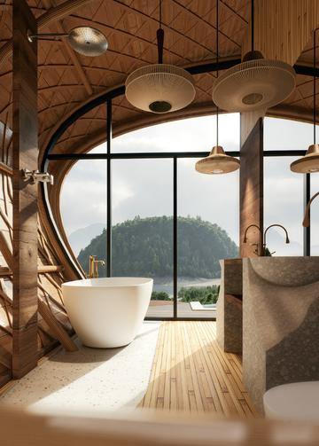 Большие стеклянные стены и арочный каркас создают поразительный визуальный эффект, пропуская много света и открывая вид на сад. Интерьеры выполнены в современной палитре мягких тонов и натуральных текстур. Черные акценты, полированный бетон, отделка тропическим деревом и встроенные стеллажи создают комфортную для жизни и в то же время современную дизайнерскую атмосферу. Кухня открытой планировки и барная стойка идеально подходят для непринужденной трапезы или развлечений, а в полностью оборудованной спальне царит атмосфера минимализма и спокойствия.