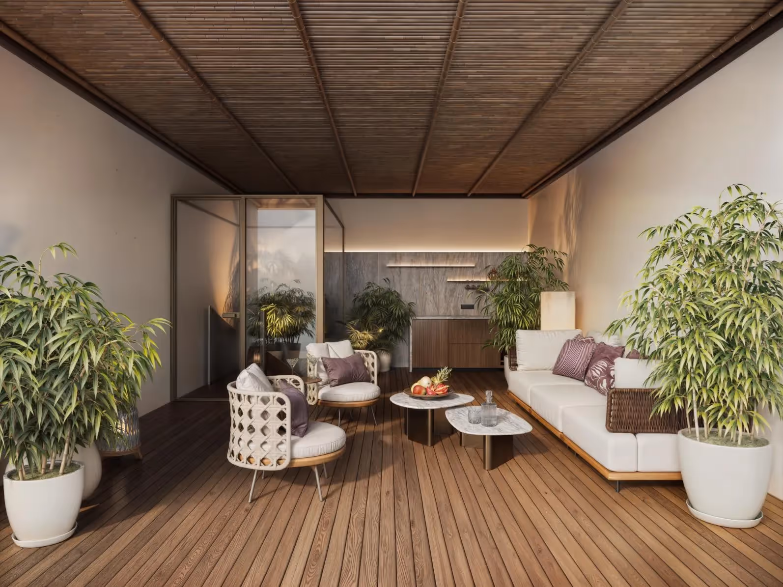 Интерьер отличается теплыми тонами пола, окружающим освещением и отделкой премиум-класса. Просторное жилое пространство выходит на террасу с видом на океан, обрамленную натуральными текстурами и бамбуковыми потолками, которая идеально подходит для обедов или отдыха на свежем воздухе. Кухня и обеденная зона открытой планировки органично вписываются в мягкую нейтральную палитру спальни, а ванная комната отличается лаконичной утонченностью, встроенными шкафами для хранения вещей и акцентами, отделанными каменной плиткой.
