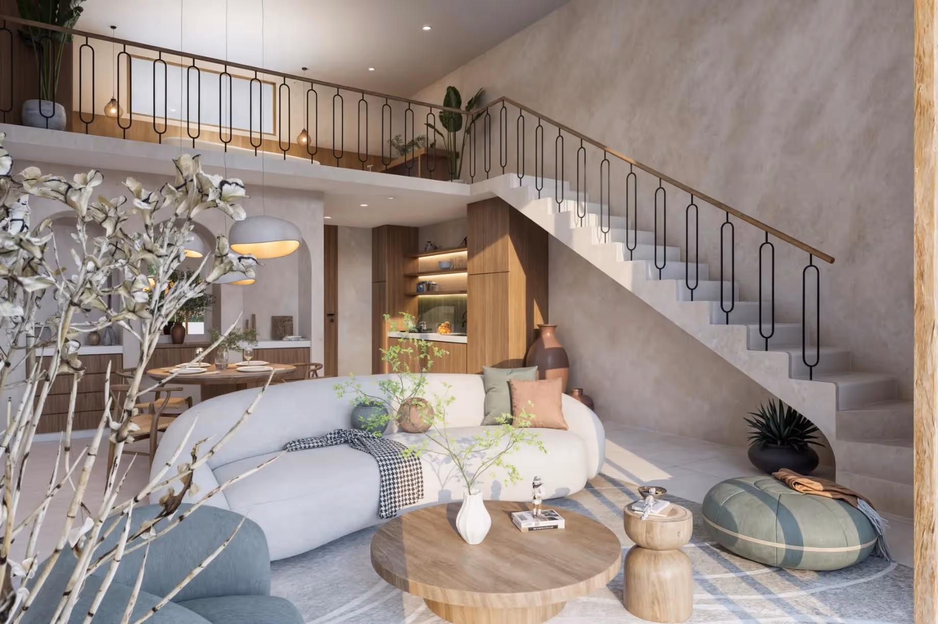 Каждая квартира имеет общую площадь более 81 м² плюс балкон площадью 18 м² с продуманной планировкой с 1 спальней и 1 ванной комнатой в двухэтажном лофте. Природные текстуры, изогнутые стены и окна от пола до потолка создают спокойную и уютную атмосферу. Гостиная зона спроектирована так, чтобы обеспечить комфорт и функциональность. Здесь есть полностью оборудованная кухня, столовая и спальня на верхнем этаже со встроенным местом для хранения вещей и рабочим местом.