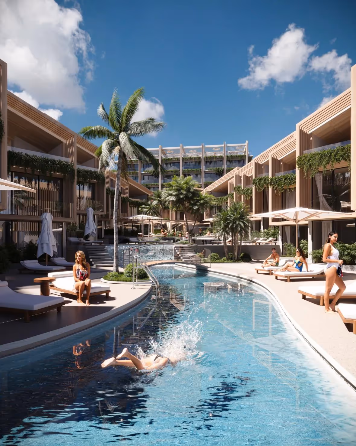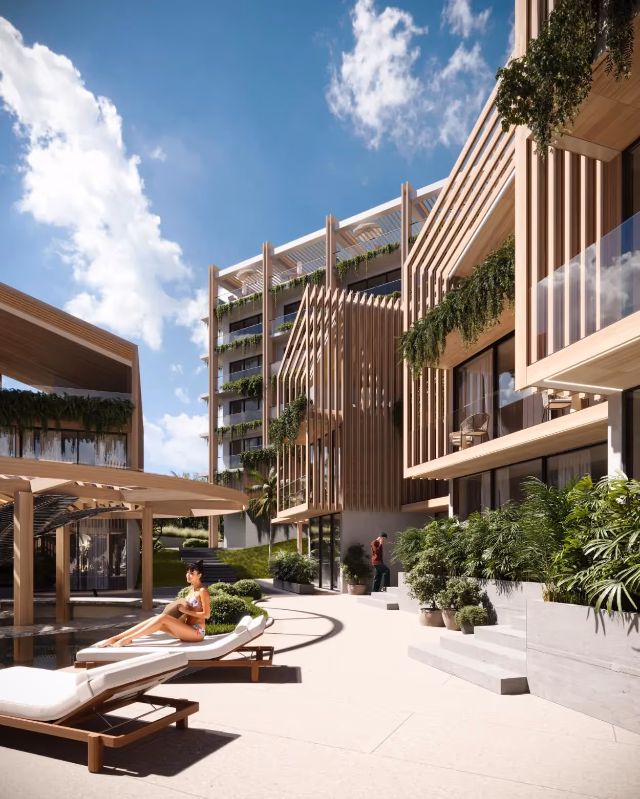 В студии есть жилая площадь 36,7 м², тщательно продуманный дизайн интерьера, изготовленные на заказ шкафы, декоративное освещение и большие раздвижные стеклянные двери, из которых открывается вид на тропический сад или море в зависимости от местоположения квартиры. Жители могут пользоваться общим бассейном в форме изогнутой лагуны, террасой для загара, баром в саду и круглосуточной охраной, что создает полноценные впечатления от отдыха в курортном стиле.