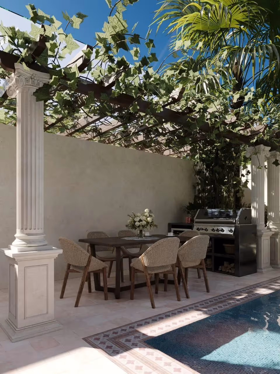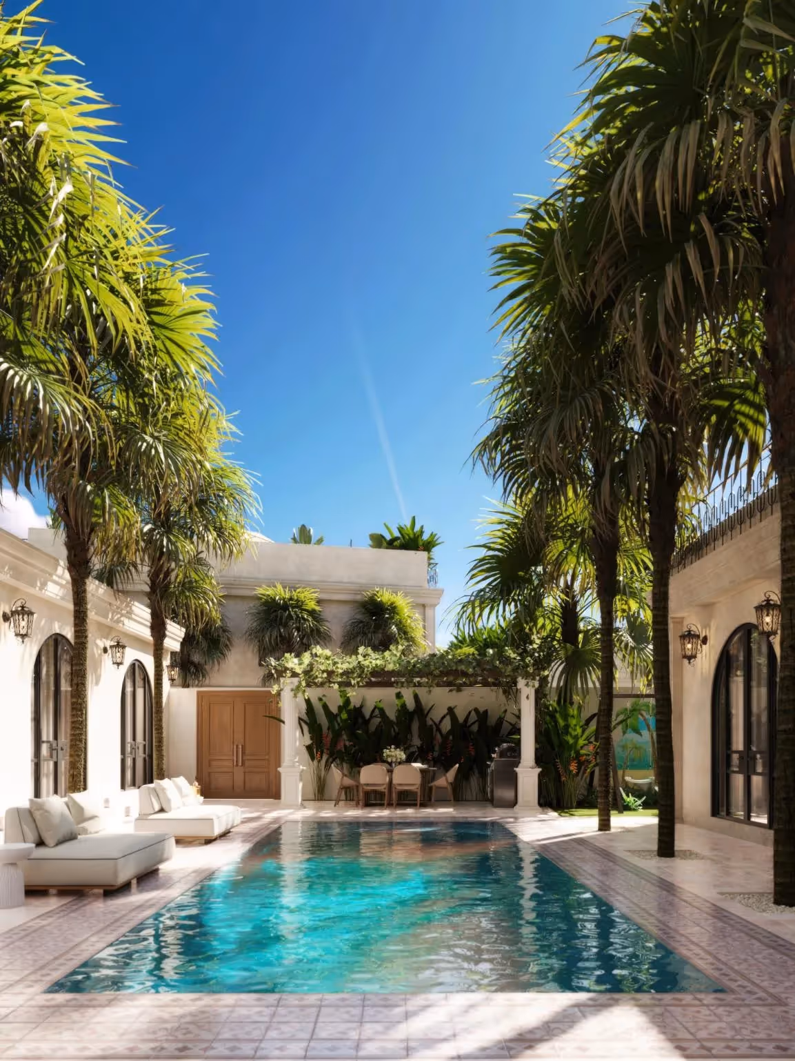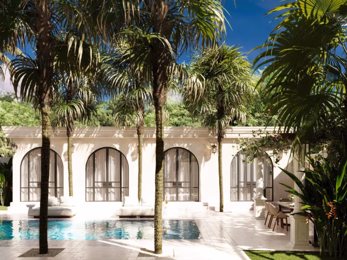 Архитектура сочетает в себе неподвластную времени элегантность с тропическим шармом — роскошные открытые площадки дома обрамляют большие арочные окна, изысканные фасады и просторные террасы. Внутри кессонные потолки, изготовленная на заказ мебель и открытая планировка соединяют гостиную, столовую и полностью оборудованную кухню для гурманов.