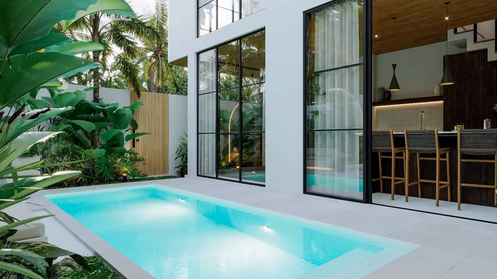 Вилла занимает площадь 169 м² на участке площадью 105 м² и имеет стеклянные фасады от пола до потолка, уютную крытую гостиную и зону отдыха на крыше, идеально подходящую для развлечений или коктейлей на закате. В доме есть 3 спальни и 2 ванные комнаты, полностью оборудованная дизайнерская кухня и такие удобства на открытом воздухе, как собственный бассейн и вид на океан. В отделке интерьера сочетаются темное дерево, матовые текстуры и мягкое освещение — спокойная естественная палитра, гармонирующая с окружающей природой.
